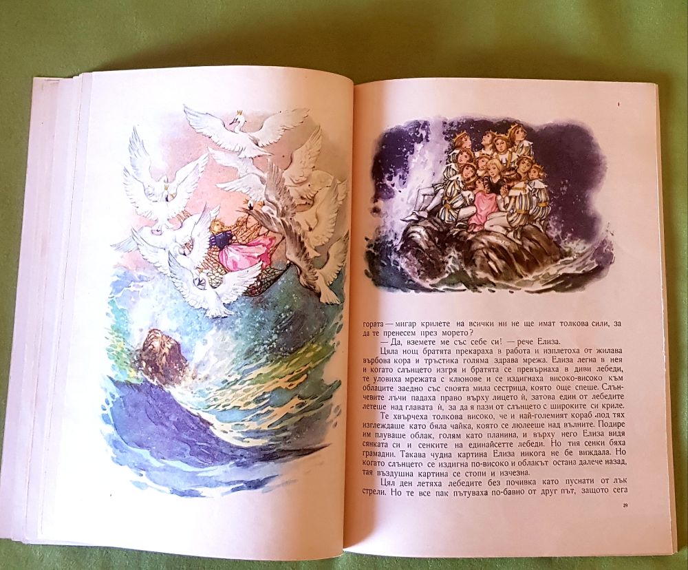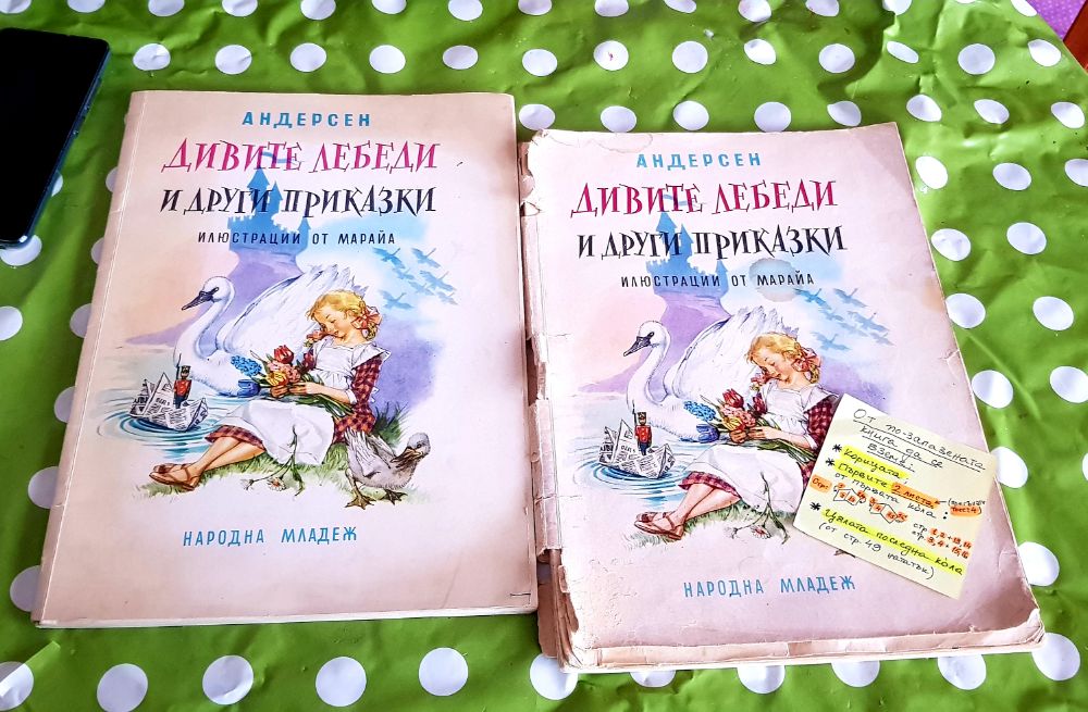 Оказа се, че „Дивите лебеди“ е любима книжка на клиентката ми. Донесе ми две сравнително стари издания. Едното от 70-те години беше с по -пастелни илюстрации и съответно изглеждаха по-красиво.