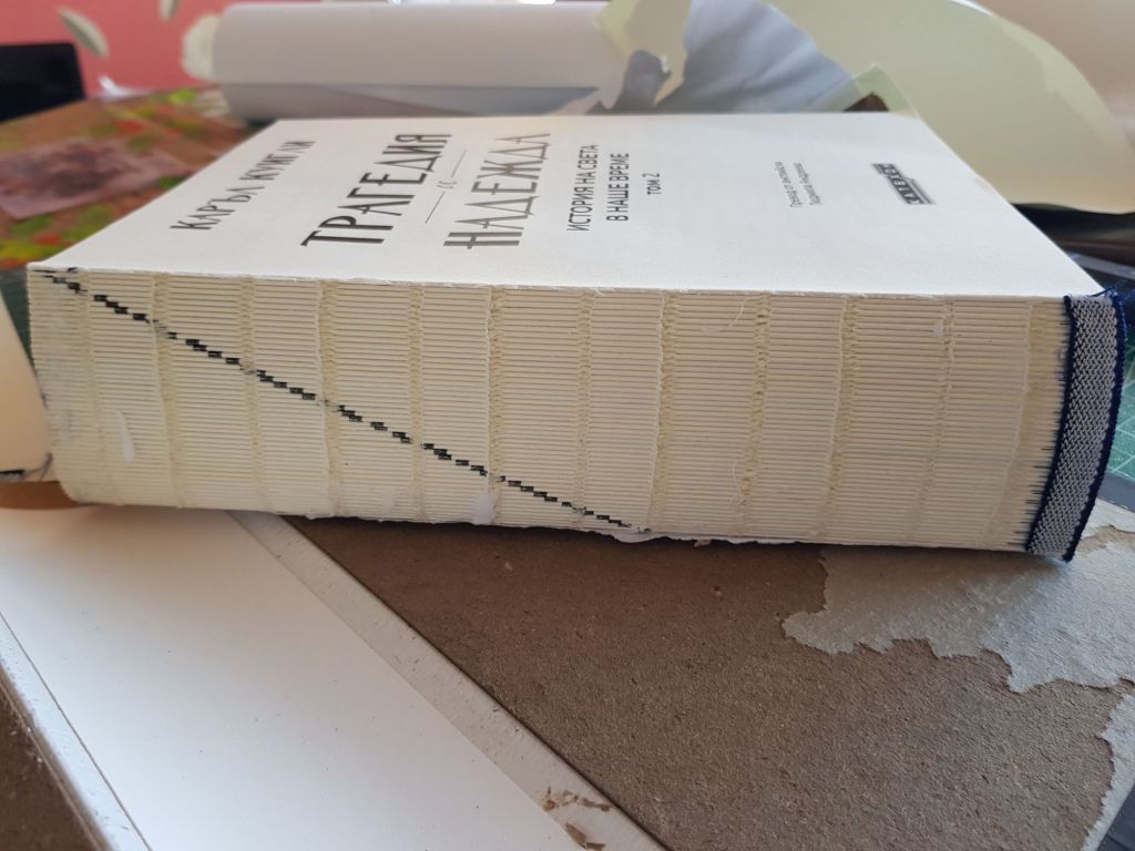 Книги с твърда подвързия На изображенията по-долу, става въпрос за книга с твърда корица и голям обем страници. Клиента ми я донесе за поправка още преди да я е прочел цялата. При разподвързването се вижда, как производителя е спестил от тифона, а вместо него е използвал тънко парче хартия, която на практика не върши абсолютно никаква работа. Самият гръб също не е стабилизиран допълнително. Форзаците не бяха съобразени с тежестта на книжното тяло. В този случай укрепих допълнително гръбчето на книгата, добавих дишащ текстилен памучен плат за повече здравина, изработих нови форзаци в грамаж на хартията достатъчен, че даде стабилност.